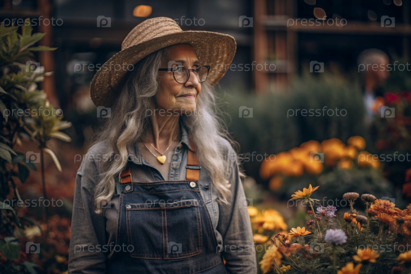 Пожилой садовник с седыми волосами в комбинезоне в уютной цветочной теплице