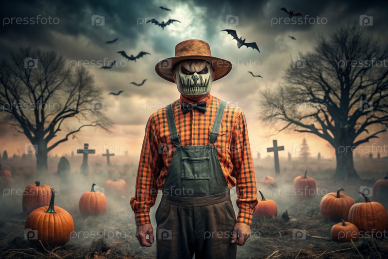 Концепция Хэллоуина. Ужасная. Страх. Устрашающий богий с тыквенной головой, квадратной рубашкой и бабочкой. Баннер, открытка