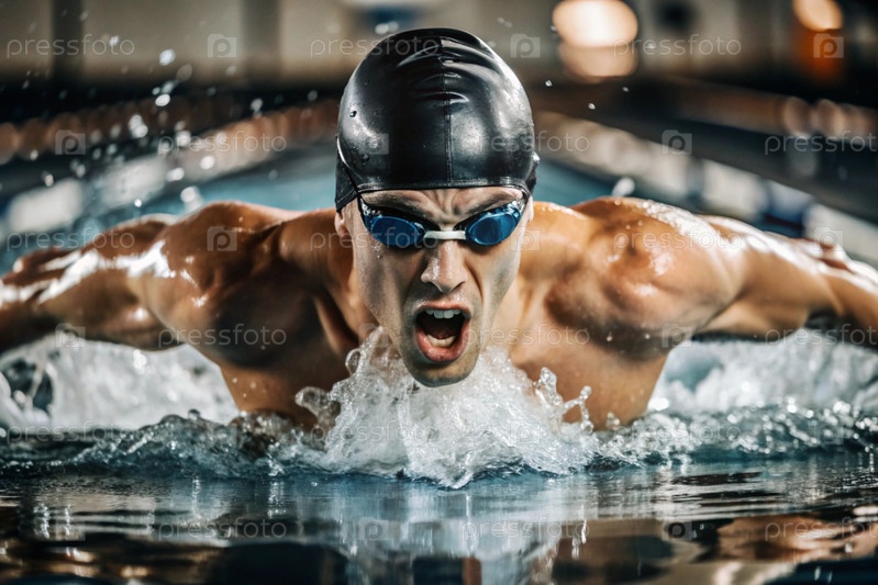 Спортивное плавание. Мужчины-плаватели. Спортсмен с очками в бассейне во время соревнований на близком расстоянии. Человек смотрит на камеру