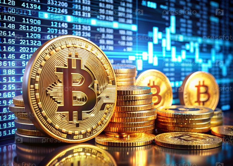 Криптовалюта.Золотые монеты - это биткойны.Изображение создано с использованием искусственного интеллекта