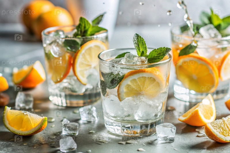 Вкусный свежий апельсиновый и цитрусовый лимонад с мятой, кубиками льда и ломтями арбуза. освежающий летний напиток