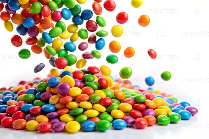 Цветные конфеты в ассортименте на белом фоне. Различные сладости, кондитерские изделия и драже различных форм и цветов. Яркие тени радуги