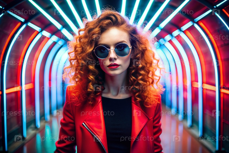 Молодая стильная красивая девушка в солнцезащитных очках стоит в неонном туннеле среди неоновых вывесок
