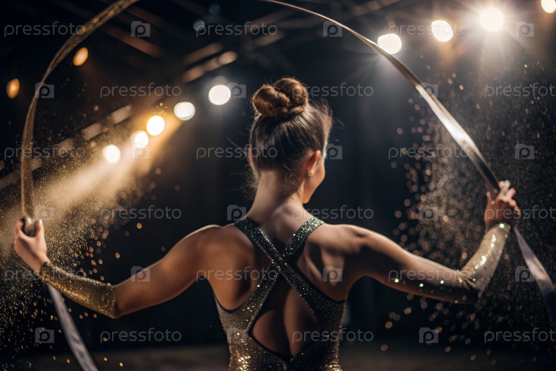 Ритмическая гимнастика - это крупный план красивой гимнастки с лентой в центре внимания на спортивной арене