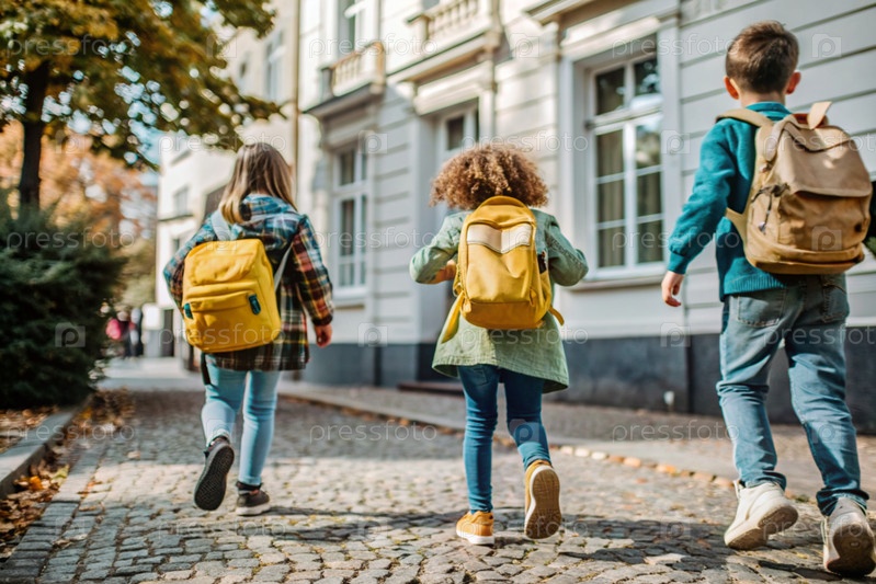 Праздник приходится на 1 сентября. Дети с желтыми рюкзаками бегут в школу. Обратный взгляд. Давайте вернемся в школу. Концепция нового учебного года в школе. Осенний день знаний