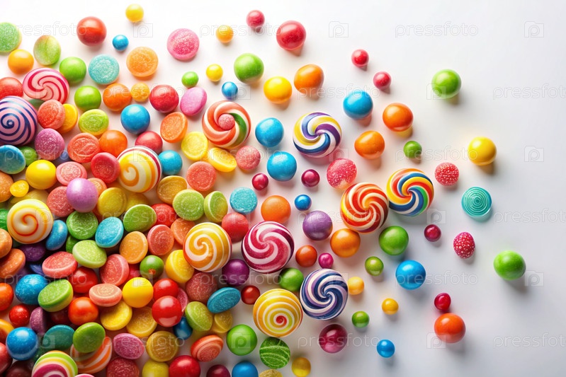 Цветные конфеты в ассортименте на белом фоне. Различные сладости, кондитерские изделия и драже различных форм и цветов. Яркие тени радуги