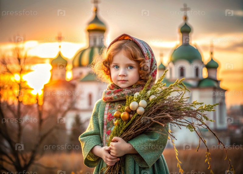 Пальмовое воскресенье. христианство. портрет трехлетней девочки в русском народном шале с ветвями ивы в руках на фоне православной церкви