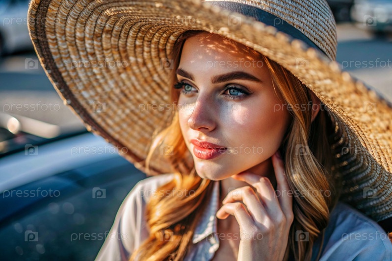 Летние каникулы на пляже, крупный план красивой женщины в соломенной шляпе.Лето.Отдых и отдых, место для копирования