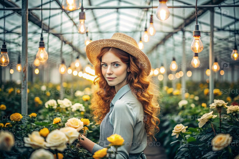 Портрет красивого садовника с рыжими волосами в соломенной шляпе, работающего с розами в стеклянной теплице