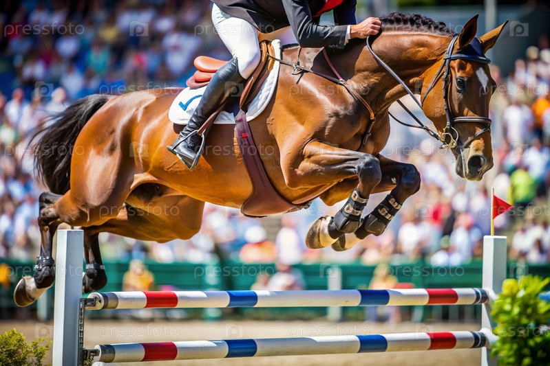 Близкий план олимпийской лошади и всадника, перепрыгивающих через препятствие на открытой арене - это конная езда
