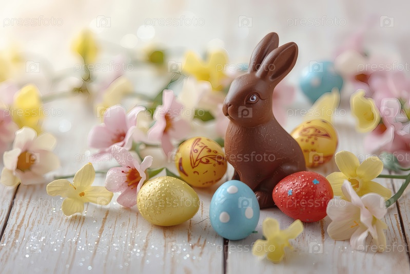 Шоколадное пасхальное яйцо, шоколадный кролик и весенние цветы на деревянном фоне. Пасхальные сладости и лакомства. Концепция яркого праздника Пасхи в 2026 году. Хорошая открытка