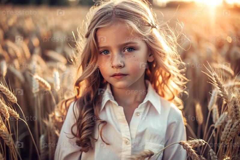 Красивая девочка в белой рубашке с золотыми волосами стоит на поле созревшей золотистой пшеницы при закате солнца.Урожай, сельская природа и жизнь