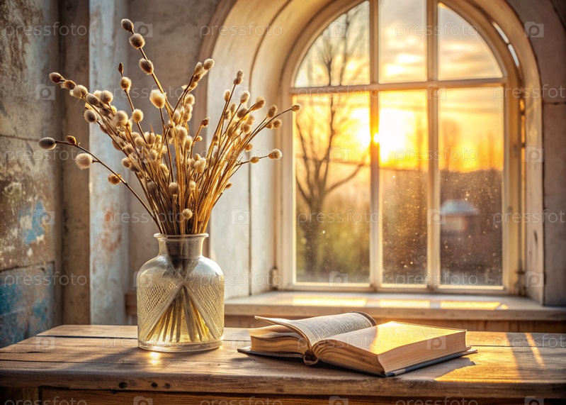 Большой план букета ивы в стеклянной вазе и книги Библии напротив старого белого окна с видом на золотые куполы храма и заходящее солнце