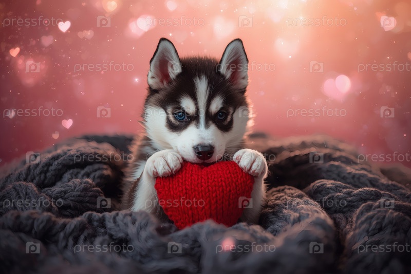 Концепция Дня святого Валентина. красное вязаное сердце в объятиях хаски. открытка с бело-серой собакой, лежащей на вязанном одеяле