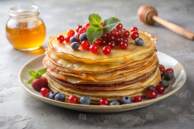 Вкусные блины с медом, ягодами, чернилами, клюквами и малиной.Концепция российского праздника Масленица