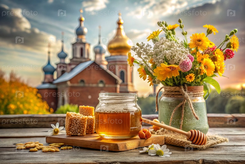 Концепция российского православного праздника 'Мёд Спаситель'.Стеклянная кружка с медом, сосны и букет диких цветов на фоне Православной церкви
