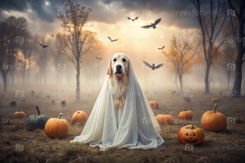 Собака в костюме призрака Хэллоуина. золотой ретривер сидит в мрачном осеннем парке с крестами, летучими мышами и тыквами