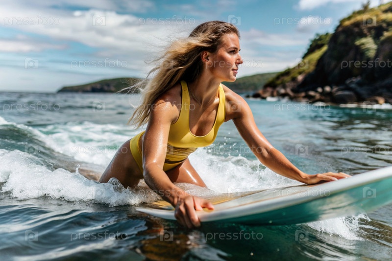 Женщина на доске для серфинга в купальнике в океане в солнечный день