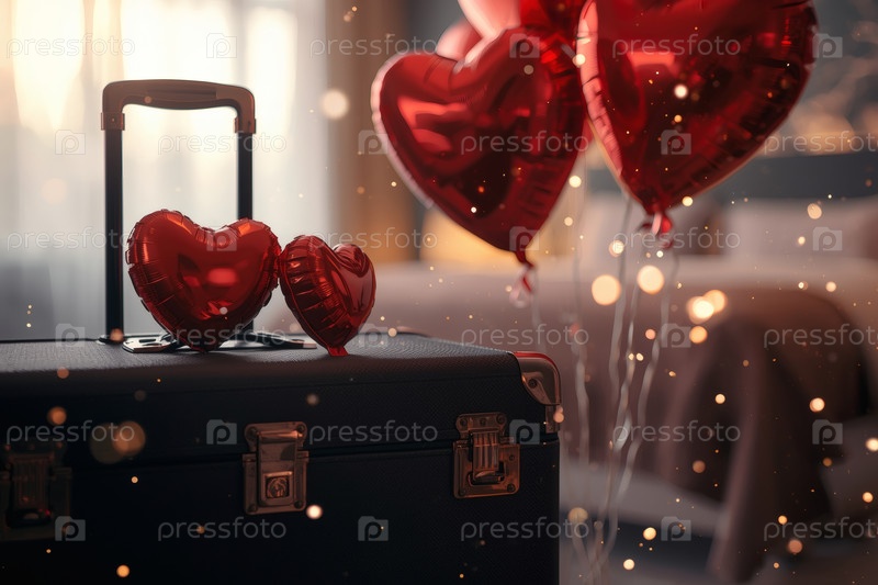 Балонный чемодан в форме сердца в гостиничном номере, чтобы отпраздновать День святого Валентина.Романтический праздник для двух любовников, действие 14 февраля