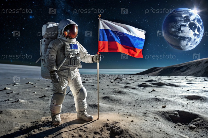 Счастливый День космического пространства.Астронавт в костюме устанавливает российский флаг в космосе на Луне.Впечатляющий вид планеты Земля
