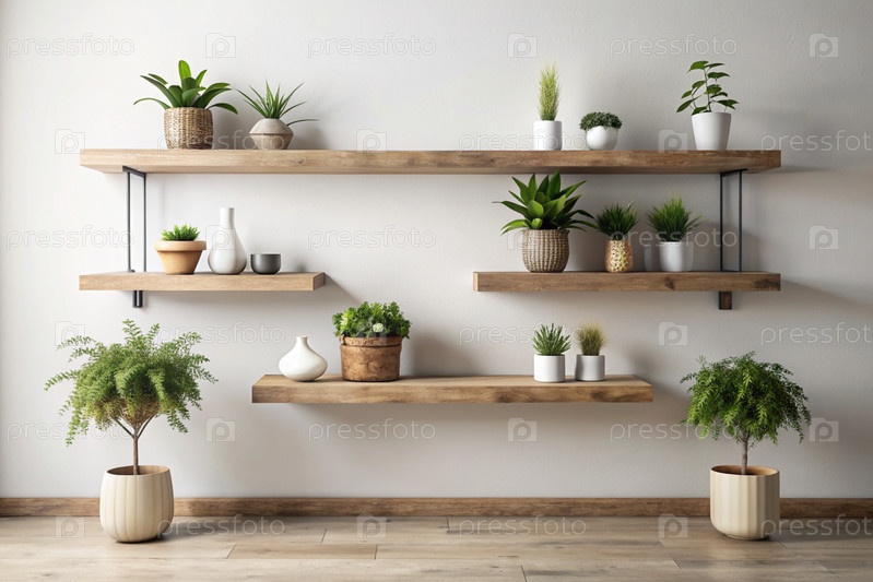 Детали дизайна интерьера. На яркой стене расположены деревянные полки с горшковыми растениями. Скандинавский стиль