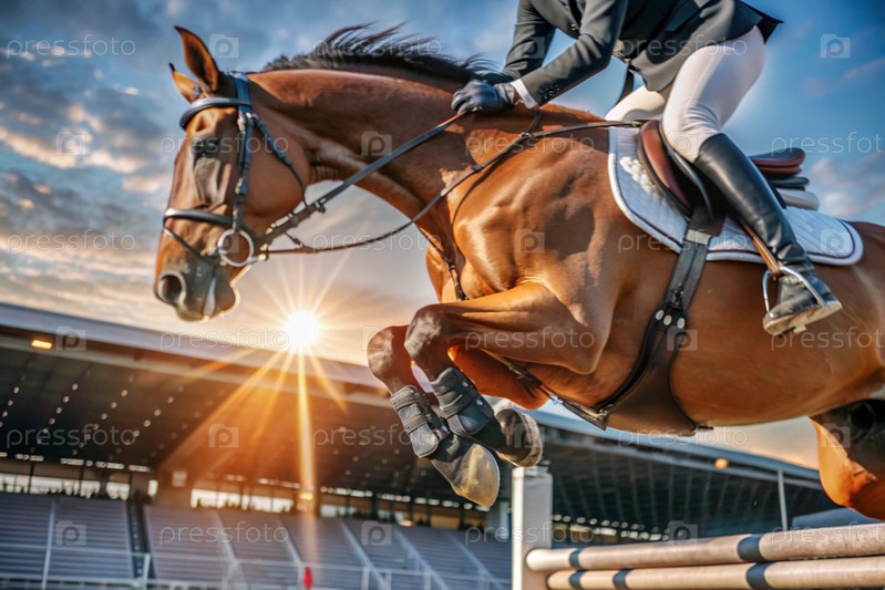 Близкий план олимпийской лошади и всадника, перепрыгивающих через препятствие на открытой арене - это конная езда