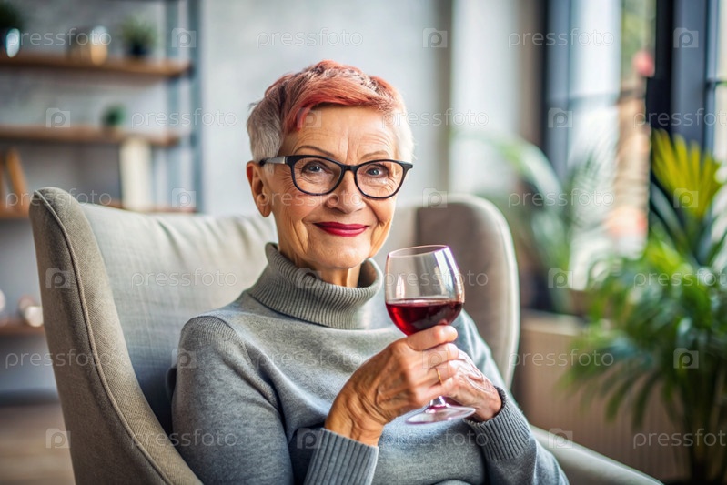 Современная, стильная пожилая женщина с бургундскими волосами со стаканом красного вина на стуле в гостиной дома