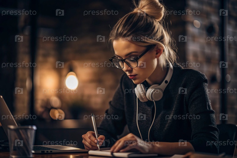 Молодая женщина фрилансер в очках и наушниках работает на ноутбуке или делает покупки в интернет-магазине