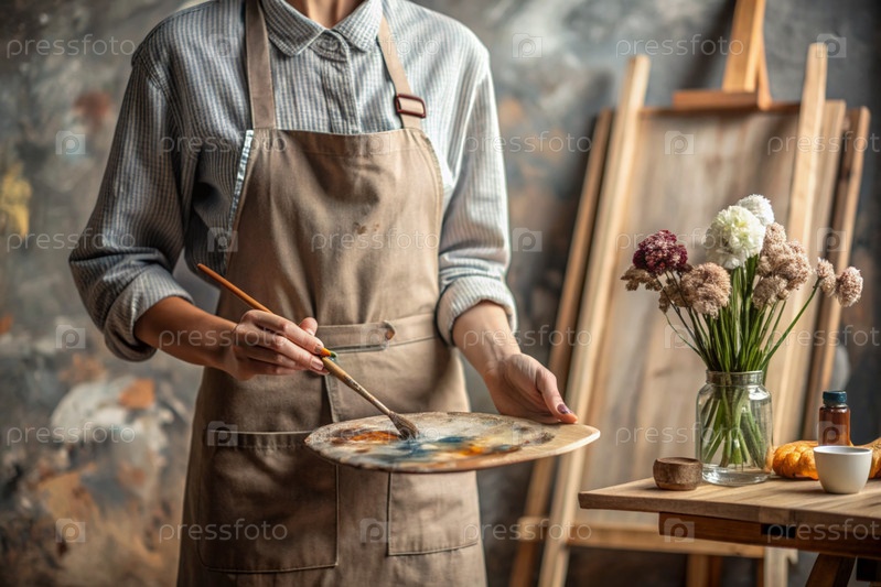 Близко. Понятие творческой деятельности. Художник в мастерской с маслом и кистью в руках. Искусство, креативность и отдых