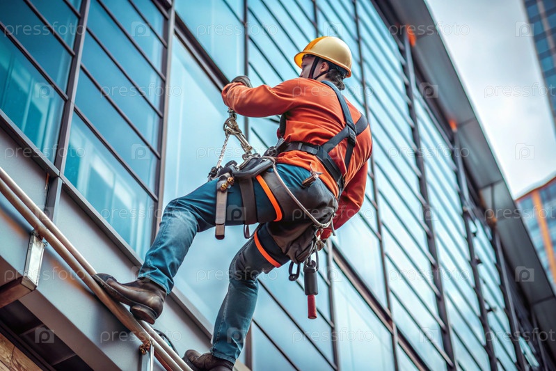 Мужчина-строитель в защитном снаряжении, ремнях безопасности и с крючками для ремней безопасности для работы на большой высоте