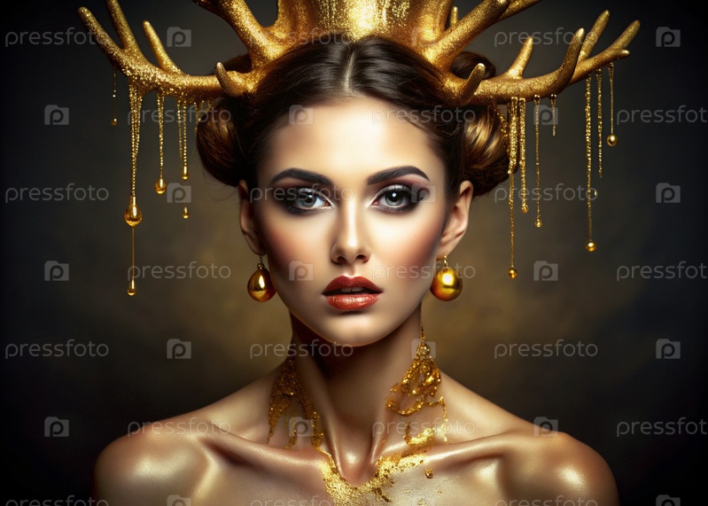 Творческий баннер для салона красоты в черно-золотых тонах. Профессиональный макияжный художник, стилист и парикмахер. Красивая женщина с вечерним гримом и золотыми рогами на голове. Индустрия красоты