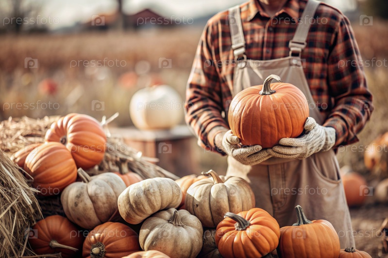 Руки мужчины в квадратной рубашке с тыквенным крупным планом и красивым осенним рисунком. Сбор тыков. Концепция празднования Дня благодарения и Хэллоуина