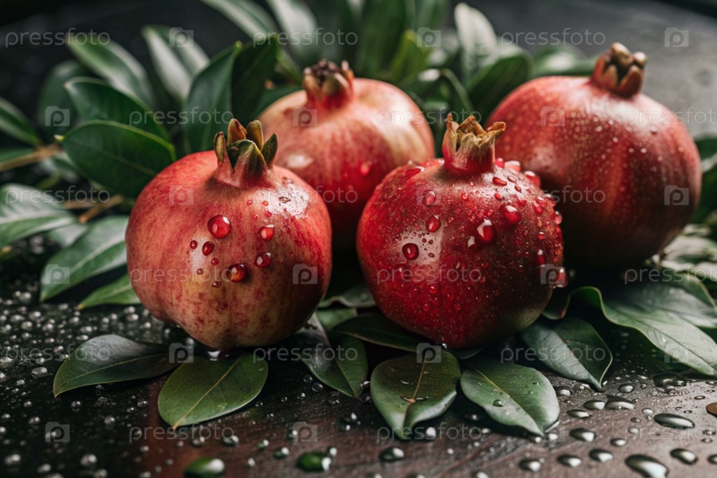 Свежие красные гранаты. Вкусные фрукты ярко-красного цвета с капельками воды. Вегетарианство. Здоровое питание. Свежие плоды на столе