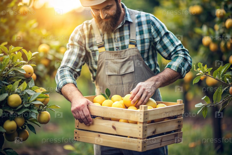 Сельскохозяйственная промышленность. Деревянный ящик с лимонами в руках фермера. Садовник собирает богатый урожай. Ближе, солнечный свет. Осенний плодовый сбор