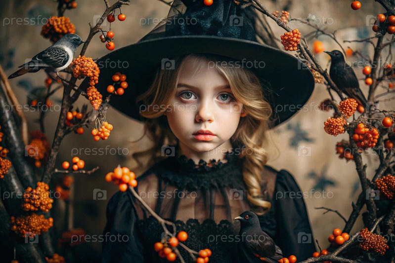 Осенний портрет красивой девушки в костюме ведьмы с осенними ягодами, тыквами и черными птицами. баннер, открытка. концепция Хэллоуина