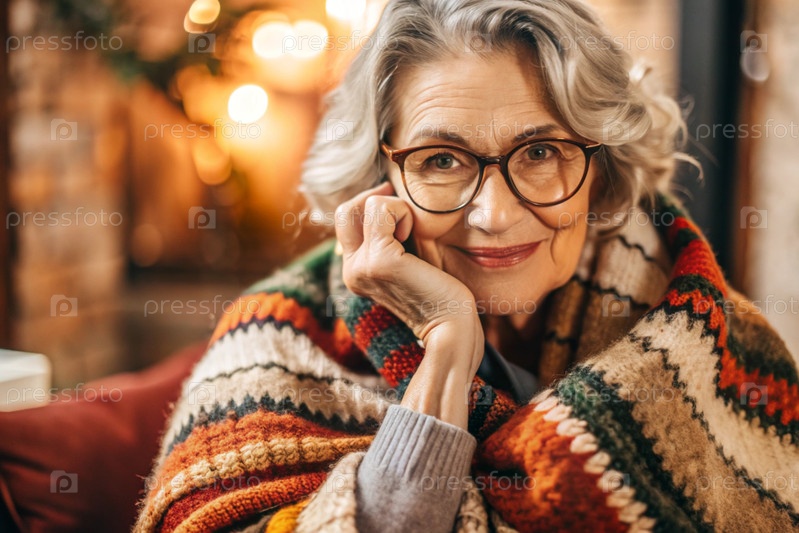 Осенний портрет красивой пожилой женщины, пенсионерки 70 лет. Он завернут в теплую клетку с этническим рисунком. Концепция жизни пожилых людей