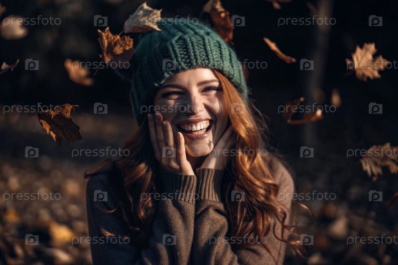 Осенний портрет. Близкий план молодой рыжеволосой женщины с ярко выраженными зелеными глазами в вязанной шляпе и свитере. Девушка смеется под лучами закатывающегося осеннего солнца