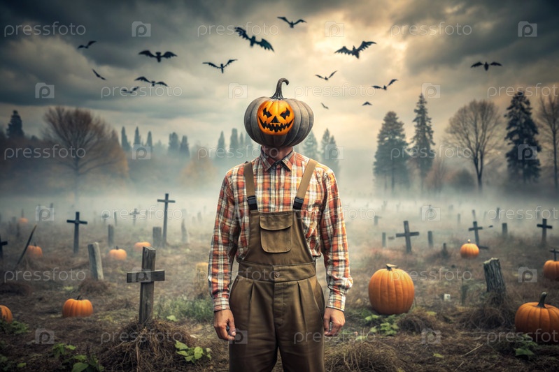 Концепция Хэллоуина. Ужасная. Страх. Устрашающий богий с тыквенной головой, квадратной рубашкой и бабочкой. Баннер, открытка