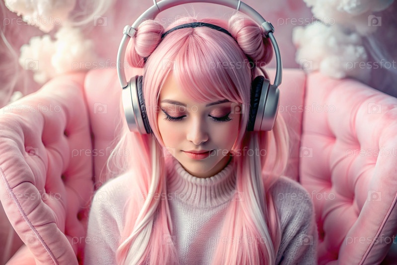 Молодая красивая японская девушка с розовыми волосами в аниме слушает музыку на беспроводных наушниках в розовых облаках