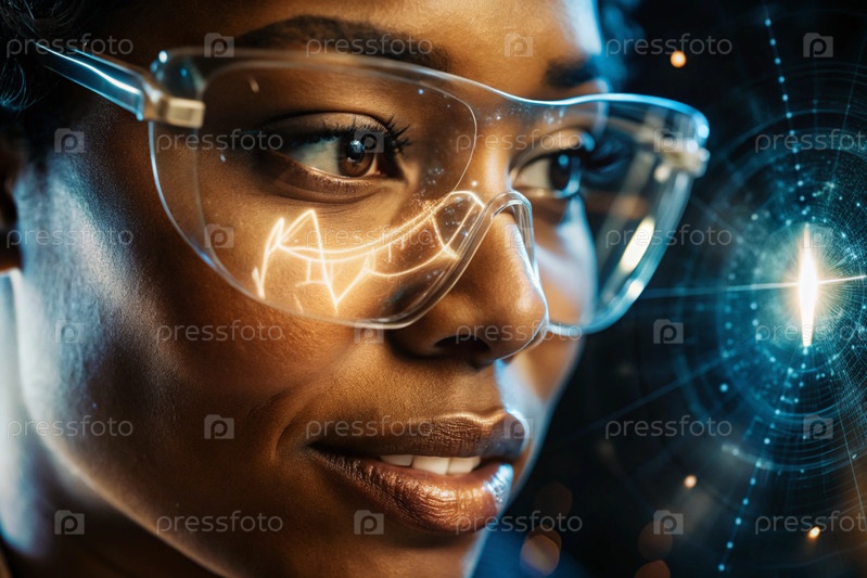 Новые технологии цифрового искусственного интеллекта в зубных протезах. Имплантаты. Чернокожая женщина-стоматолог с идеальной улыбкой и цифровой стоматологической графикой на виртуальном экране. Концепция здоровья зубов и ухода за зубами