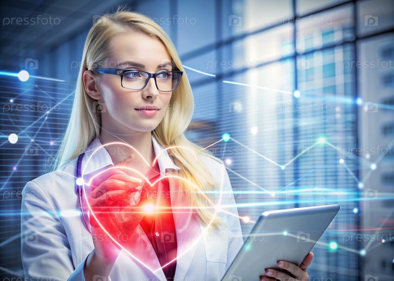 Медициной молодой красивой девушки является кардиолог с очками в кабинете со стетоскопом.Красные цифровые коды в виде частоты сердечных сокращений на виртуальном экране.Цифровые технологии будущего