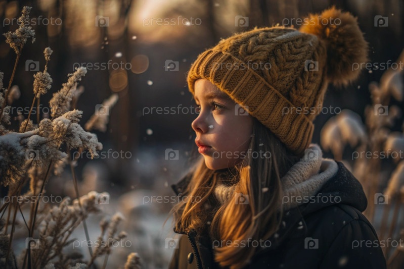 Зимний портрет. Близкий план молодой девушки в вязанной шляпе, шарфе и наружной куртке