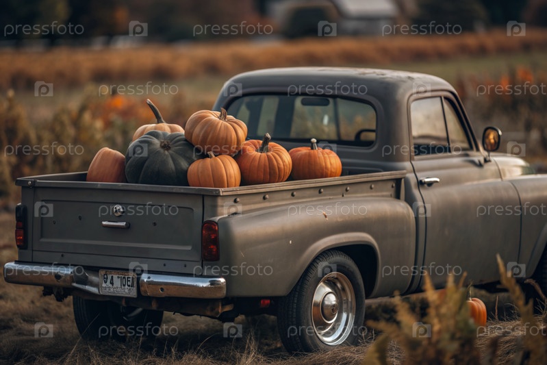 Осень, осенний дизайн.Большой урожай тыквы на заднем сиденье ретро-пикапа, крупный план