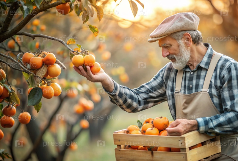 Сельскохозяйственная промышленность. Деревянный ящик с персимом в руках фермера-мужчины. Садовник собирает богатый урожай. Ближе, солнечный свет. Осенний плодовый сбор