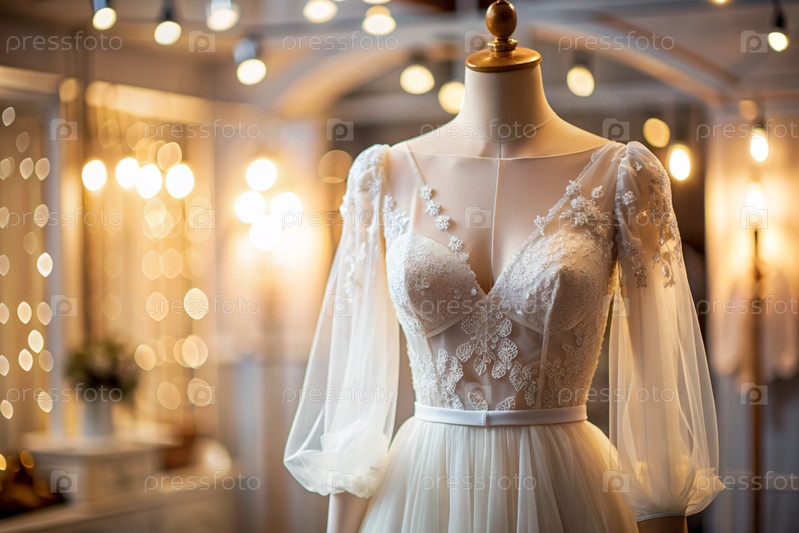 Аренда и покупка свадебных платьев для мероприятий. Близкие. Элегантное белое свадебное платье на манеке в роскошном брачном салоне