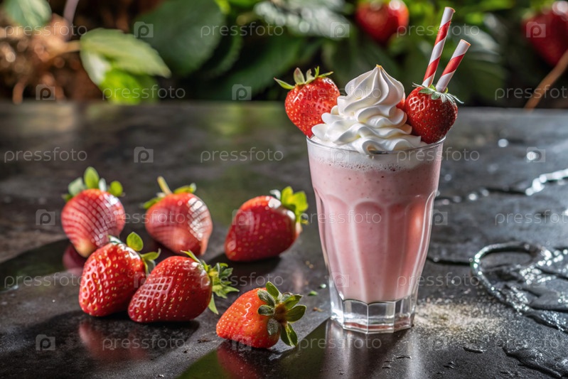 Освежающий клубниковый молочный коктейль с битой сливкой и соломой на столе, окруженном свежими ягодами