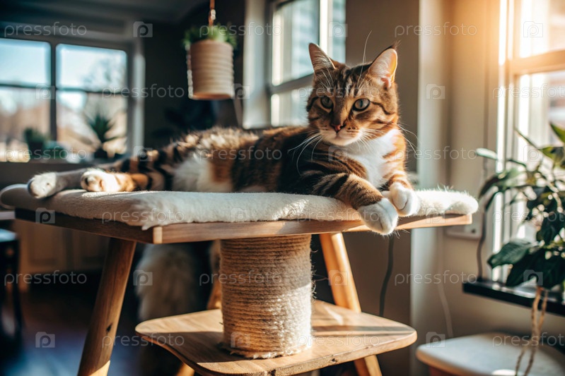 Животные.Кошка внутри дома на царапинованном столбе в солнечный день.Откормить кошку от разрыва мебели и обоев.Уход за домашними животными