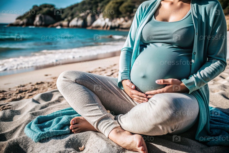 Расслабление, спокойствие, морской воздух. Закрытие живота. Беременная женщина на пляже у моря. Концепция беременности, родов и родительских обязанностей