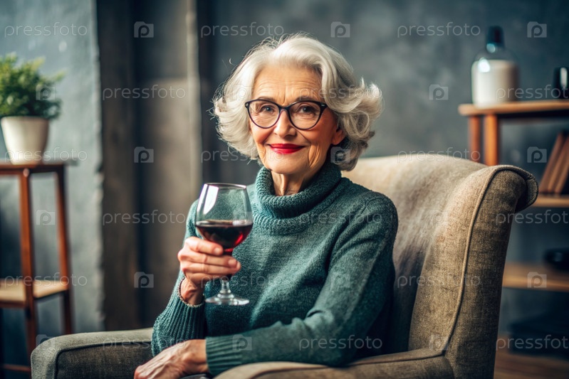 Современная, стильная пожилая женщина с короткими волосами со стаканом красного вина на стуле в гостиной дома