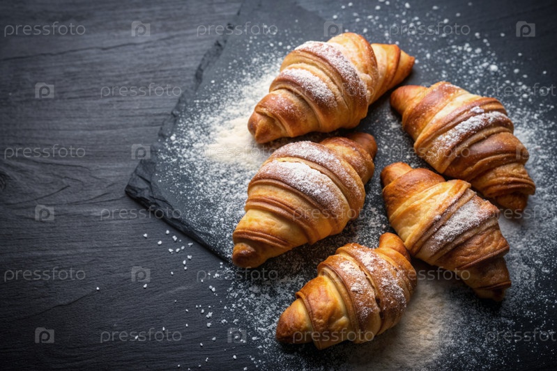 Вкусные свежевыпеченные кроассанты на тёмном фоне сланца. французский завтрак. хорошие ближневые выпечки. пекарня со вкусным хлебом. кондитерские изделия